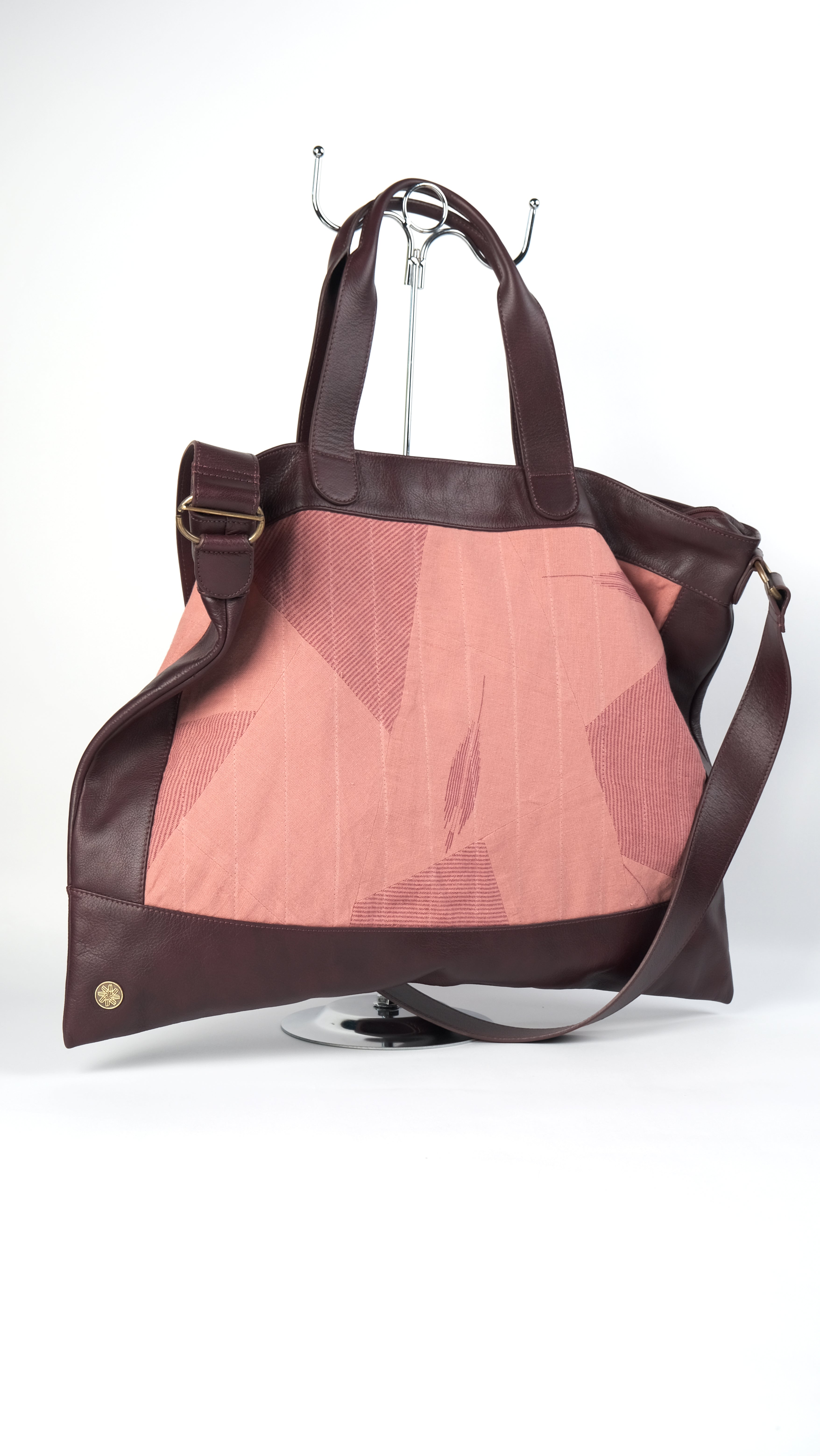 Each bag is crafted from premium Egyptian leather, framing a uniquely colored, quilted panel of handwoven Nagada linen. The structured leather provides strength to the soft quilted linen, while the contrast between the two colored materials makes every piece one of a kind.